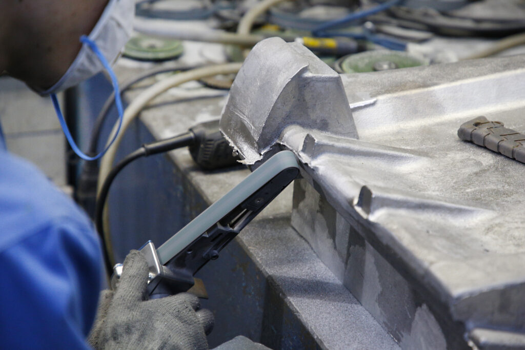 鋳造後、砂から取り出したアルミを磨く作業です。