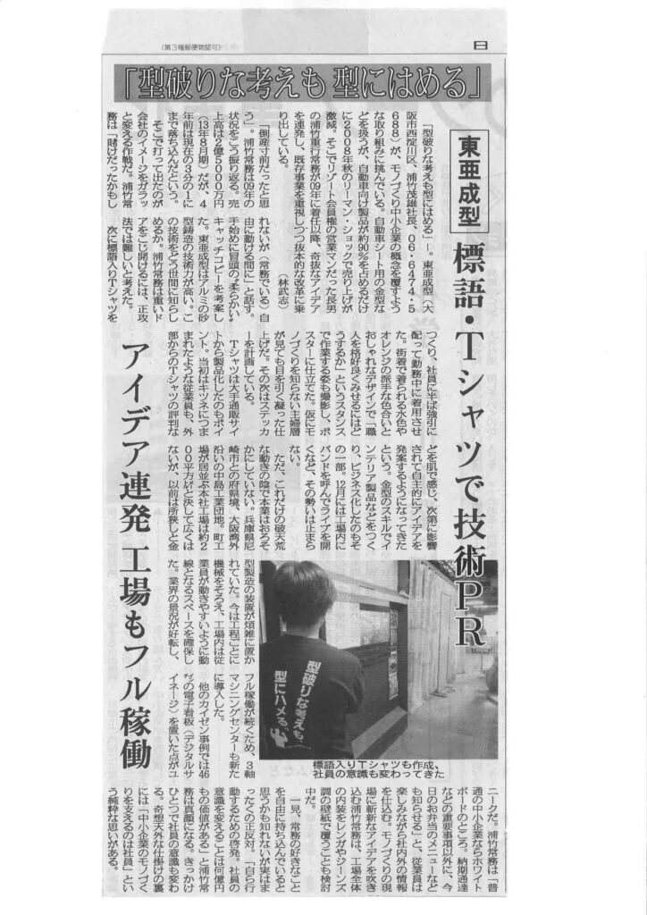 TシャツでPR!! 2013.09.13(Fri) 活動レポートすべて 日刊工業新聞 2013.12 男は背中で語る! そんな話から会社のキャッチコピーをTシャツの背中に入れました。 シャツなので現場以外でも着ることができる。 電車に乗ってると声をかけられること・・・ ある意味、広告かもしれません・・・ このキャッチコピーが浸透してくといいな・・・・