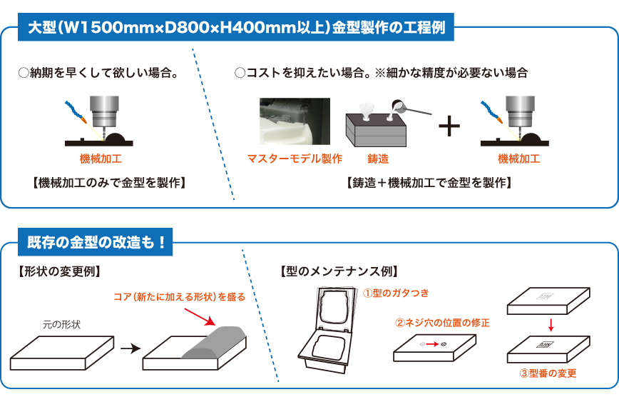 当社は金型製作に必要なCAD、マシニング、鋳造、レーザー加工、3Dプリント、組み付け、仕上げまですべて社内で完結させています。