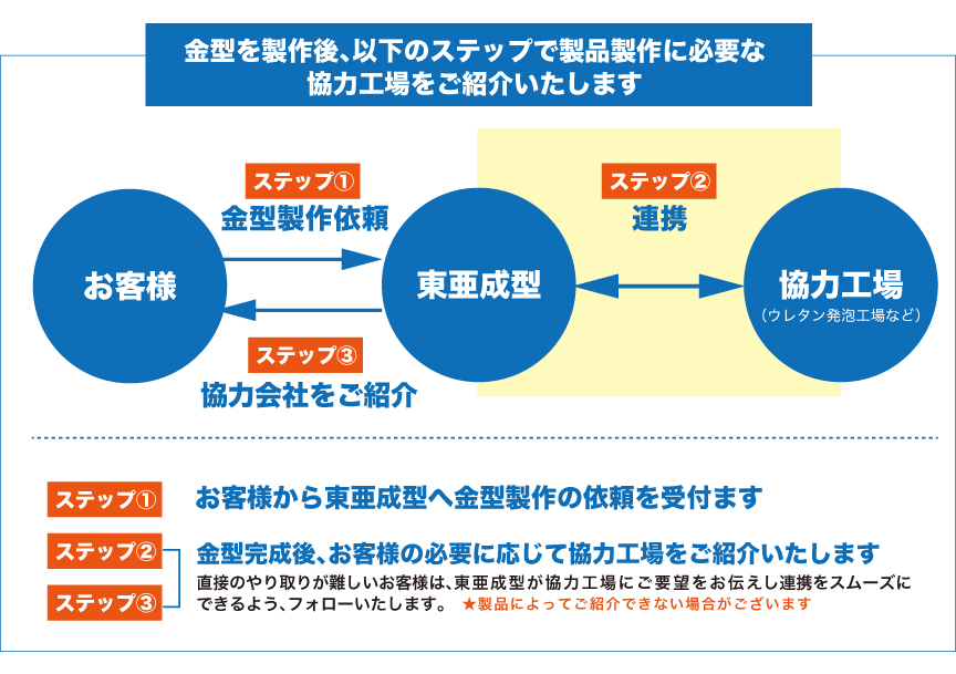 また、ご要望に応じてウレタン発泡工場や縫製工場などの協力工場へもお繋ぎいたしますので、なんなりとお申し付けください。